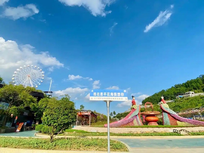 景区按照国家AAAA级旅游区标准规划建设,总占地面积达630余亩,地貌层次多变,视野感受丰富。目前已经建成开放四季花海景观、2.8公里仿古观光长城、长城文化科普馆、花卉植物科普园以及山顶观光摩天轮、欢乐世界机动乐园、特色商业街、美食餐厅等休闲娱乐项目,并斥巨资建成占地面积超10000平方米的泉水乐园,包括大喇叭、造浪池、彩虹滑道、儿童水寨、环流河等经典水上项目,填补了江门大型水上运动的空白。研学体验项目儿童驾校、抓鱼水城、手工磨坊、户外拓展体能训练营等正在抓紧建设中,并将重点呈现“重走长征路”的红色主题文化体验项目。同时景区还将在温泉、度假、娱乐、演艺、拓展等方面加强配套,满足旅客吃、住、行、游、购、娱的旅游服务需求。