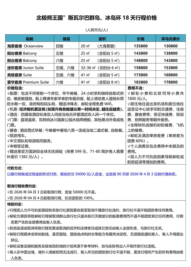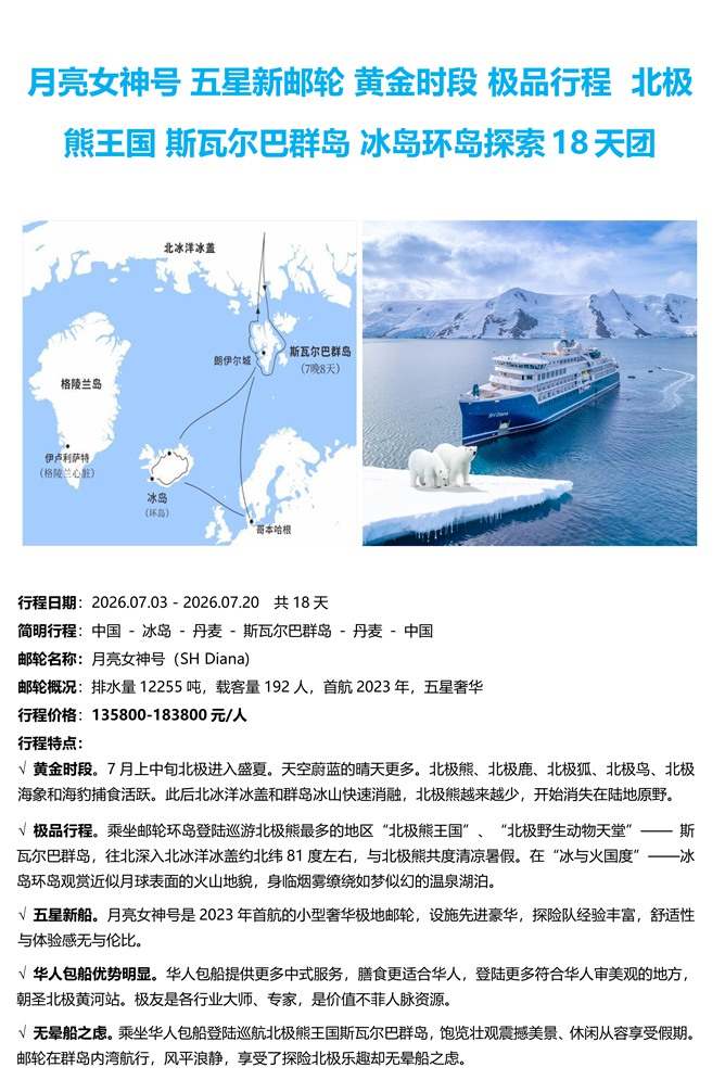 | 月亮女神号 五星新邮轮 黄金时段 极品行程 北极 熊王国 斯瓦尔巴群岛 冰岛环岛探索 18 天团2026.07.03北京出发 |