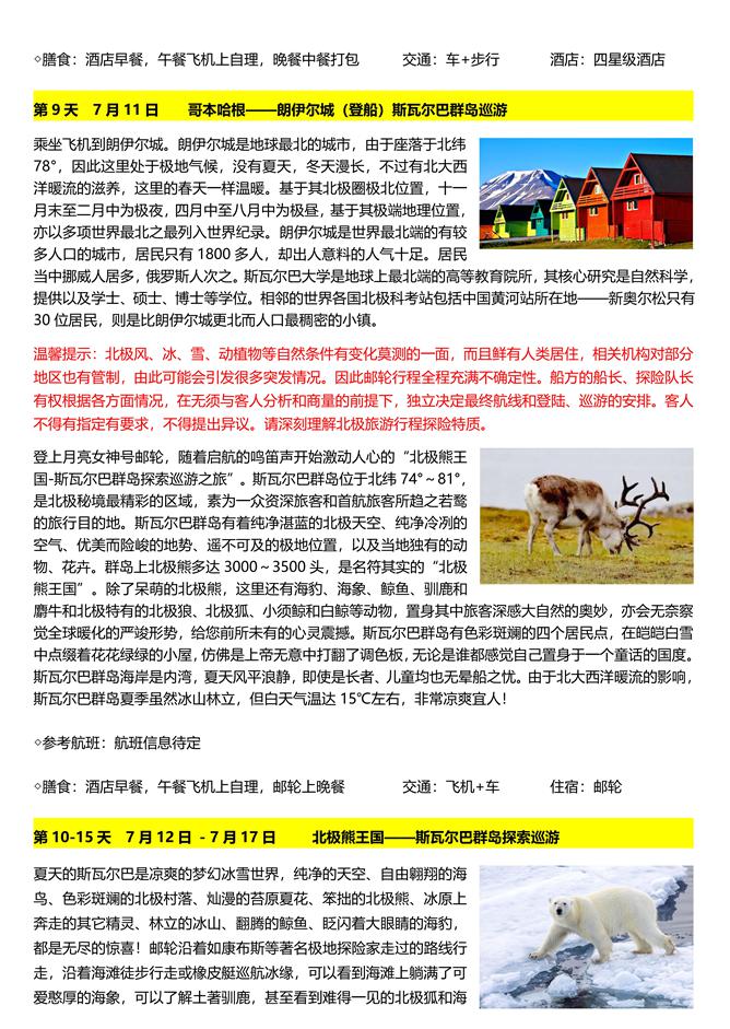 √ 极品行程。乘坐邮轮环岛登陆巡游北极熊最多的地区“北极熊王国”、“北极野生动物天堂”—— 斯瓦尔巴群岛,往北深入北冰洋冰盖约北纬 81 度左右,与北极熊共度清凉暑假。在“冰与火国度”——冰岛环岛观赏近似月球表面的火山地貌,身临烟雾缭绕如梦似幻的温泉湖泊。