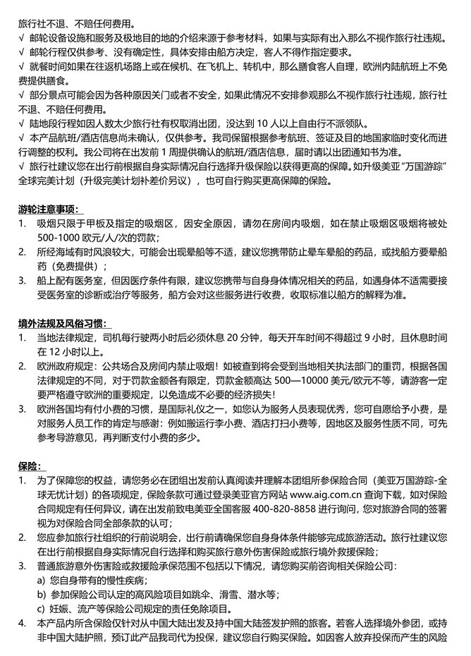 √邮轮行程具体安排如航线、是否登陆、登陆地点和时长等船方有最终决定权,无须提前通知客人,客人不得提出