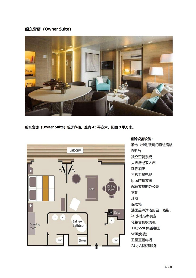 9、船东套房 Owner Suite 位于六楼 54 ㎡ (含阳台 9 ㎡)