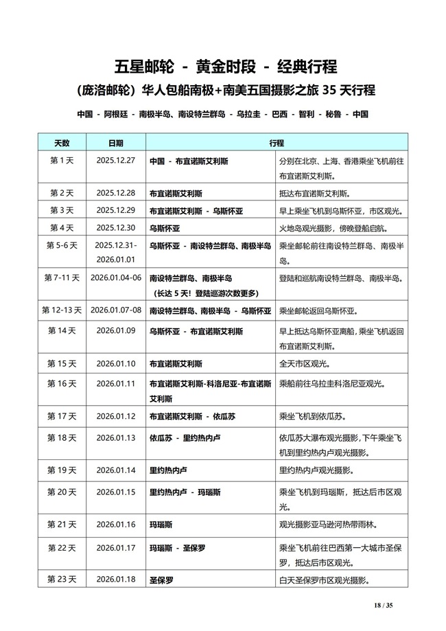 ·[庞洛邮轮]南极摄影邮轮巡游,阿根廷,乌拉圭,巴西,智利,秘鲁 南设特兰群岛,南极半岛35 天,全是中国人游南极,五星邮轮巡游35天(2026年2月18日北京,上海,香港3地出发)年初二 |