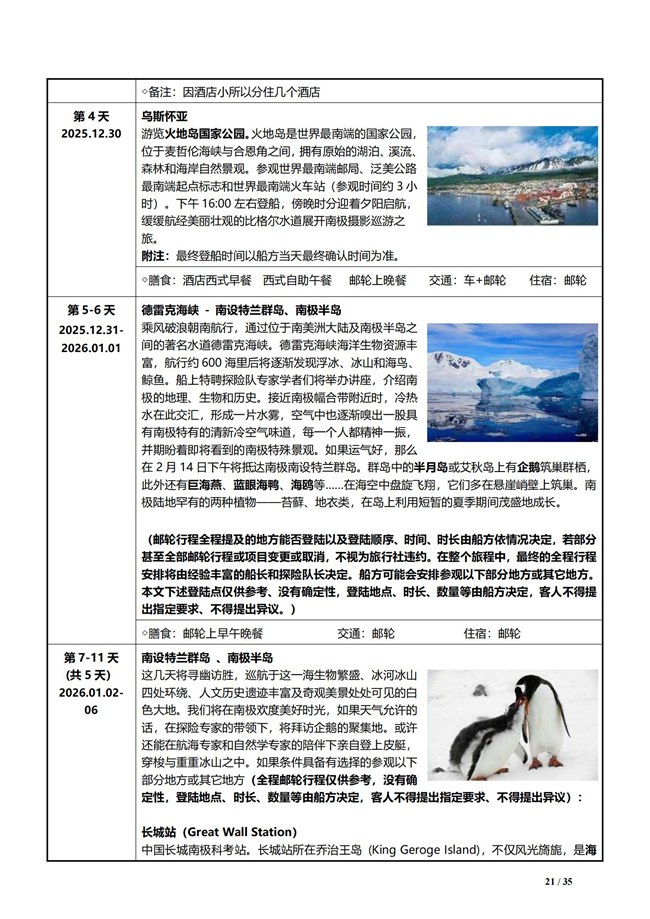 3.鉴于南极旅行高寒、高风险特殊性,处于妊娠期内的旅游者不宜参加此行程,报名参团时请如实告知身体状况,因虚假陈述或个人原因未告知旅行社而参团导致人身损害及财产损失的,其将由旅游者全部自行承担。