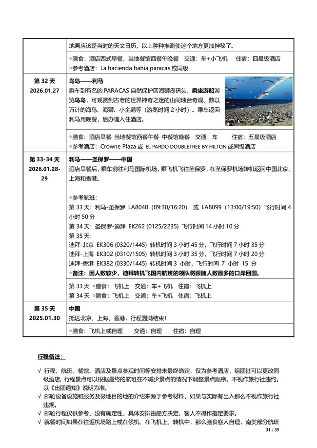 第 32 天 2026.01.27 鸟岛 - 利马 游览鸟岛,后乘车返回利马。