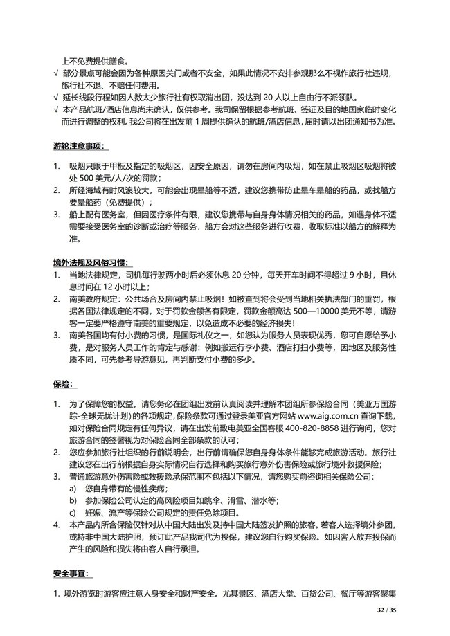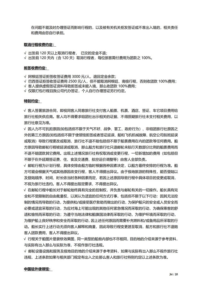 √ 巴西签证拒签收签证费用 2500 元/人,但不能取消阿根廷、南极行程,否则收团款 100%费用。