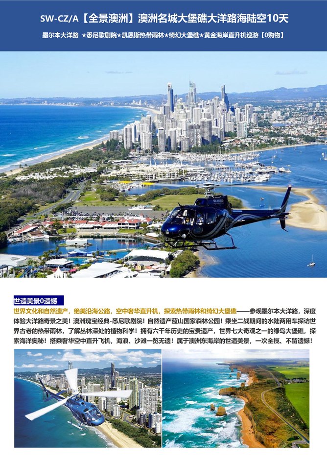 【全景澳洲】澳洲名城大堡礁大洋路海陆空10天 墨尔本大洋路 ★悉尼歌剧院★凯恩斯热带雨林★绮幻大堡礁★黄金海岸直升机巡游【0购物】国庆 |