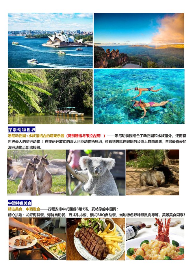 早餐:航机上 中餐:龙虾海鲜餐 晚餐:野味袋鼠肉
