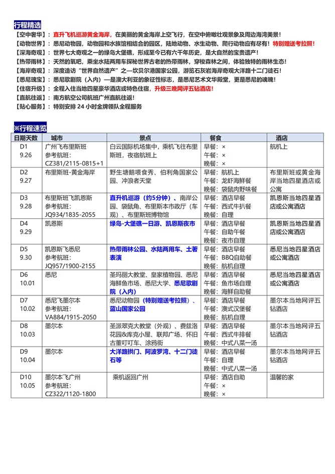 Day10 10 月 05 日 墨尔本 广州 参考航班:CZ322/1120-1800 (飞行时间约 9 小时)