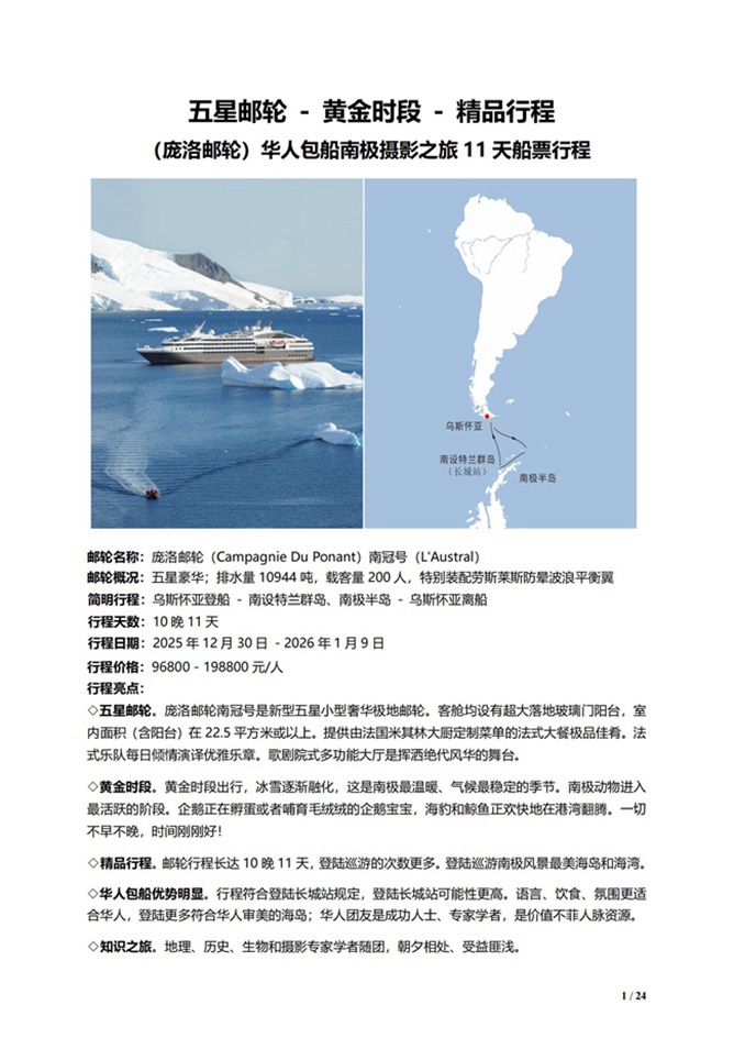 ·[庞洛邮轮]南极摄影邮轮巡游,阿根廷,乌拉圭,巴西,智利,秘鲁 南设特兰群岛,南极半岛35 天,全是中国人游南极,五星邮轮巡游35天(2026年2月18日北京,上海,香港3地出发)年初二 |