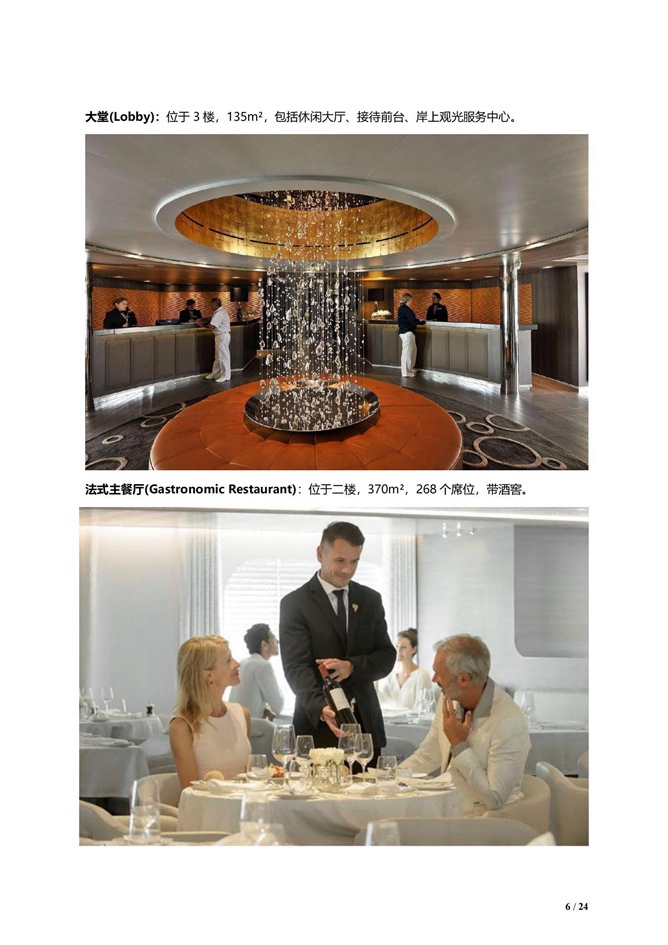 邮轮概况:五星豪华;排水量 10944 吨,载客量 200 人,特别装配劳斯莱斯防晕波浪平衡翼