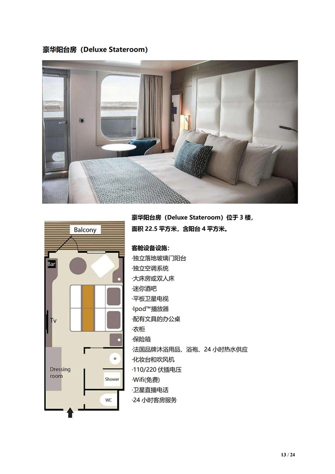 2、豪华阳台房 Deluxe Stateroom 位于三楼 22.5 ㎡(含阳台 4 ㎡) 96800元/人