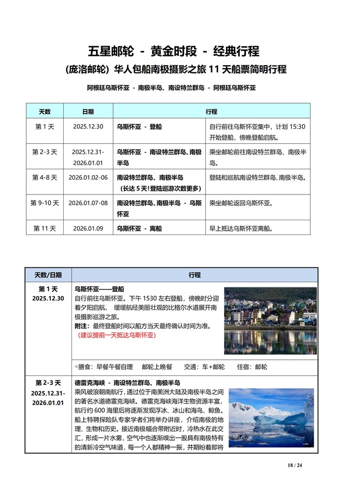 [庞洛邮轮]南冠号,包船南极摄影之旅 11 天单船票行程,2025年12月30日出发,阿根廷乌斯怀亚 - 南极半岛、南设特兰群岛 - 阿根廷乌斯怀亚 |
