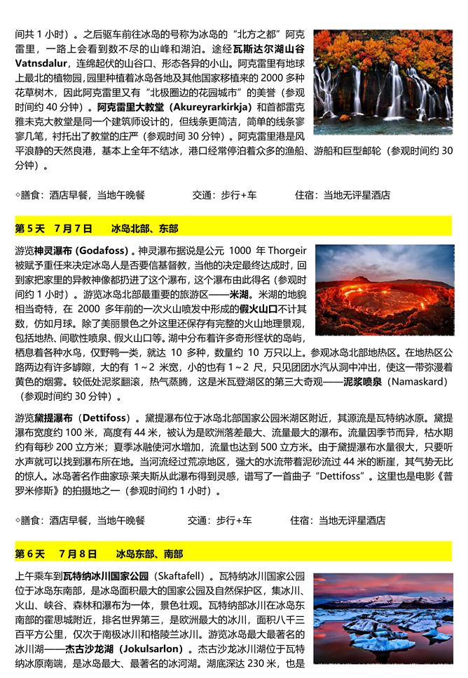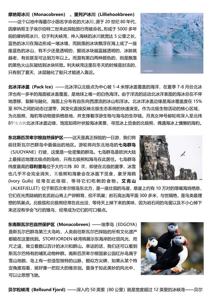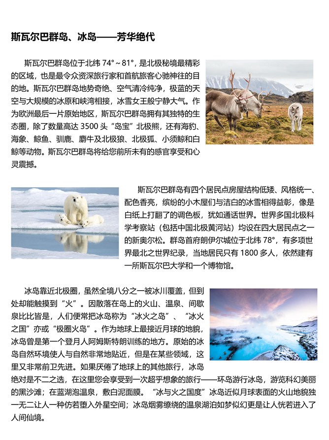 √ 极品行程。乘坐邮轮环岛登陆巡游北极熊最多的地区“北极熊王国”、“北极野生动物天堂”—— 斯瓦尔巴群岛,往北深入北冰洋冰盖约北纬 81 度左右,与北极熊共度清凉暑假。在“冰与火国度”——冰岛环岛观赏近似月球表面的火山地貌,身临烟雾缭绕如梦似幻的温泉湖泊。