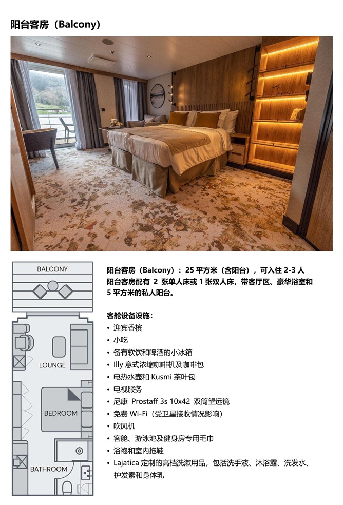 阳台客房 Balcony 五楼 25 ㎡ (含阳台 5 ㎡) 143800元/人 早鸟优惠价:138800元/人