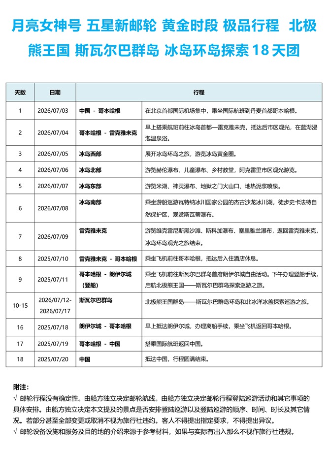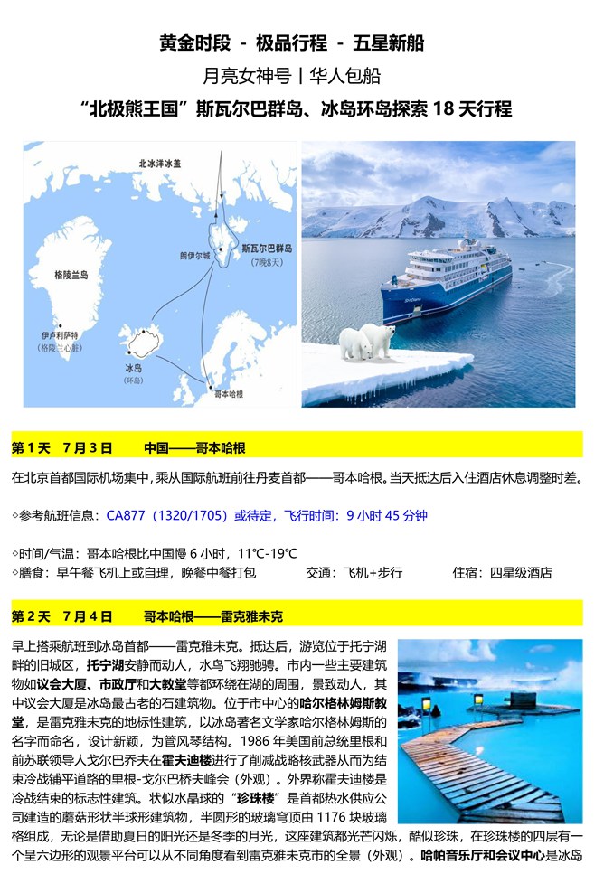 | 月亮女神号 五星新邮轮 黄金时段 极品行程 北极 熊王国 斯瓦尔巴群岛 冰岛环岛探索 18 天团2026.07.03北京出发 |