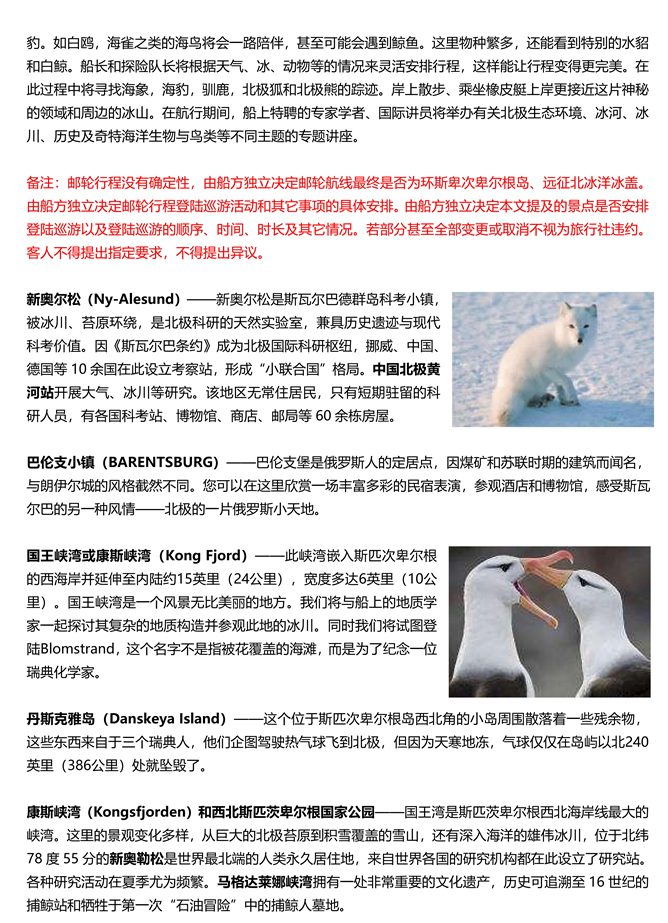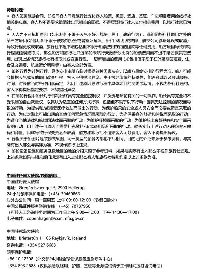 √邮轮行程具体安排如航线、是否登陆、登陆地点和时长等船方有最终决定权,无须提前通知客人,客人不得提出