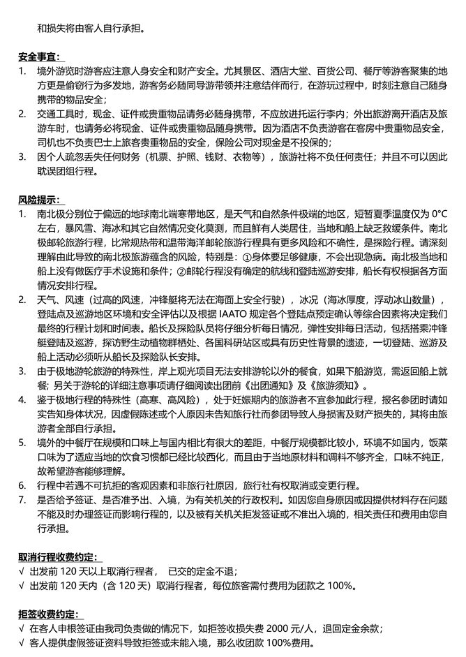√行程因人力不可抗拒原因和非旅行社原因更改甚至取消不属旅行社违约,旅行社不退不赔团款等任何费用。